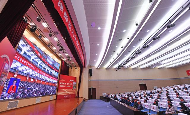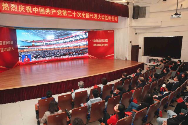 10月16日上午,天津工业大学师生在学校艺缘大礼堂集中收看中国共产党第二十次全国代表大会开幕盛况。张立 刘孜勤 摄