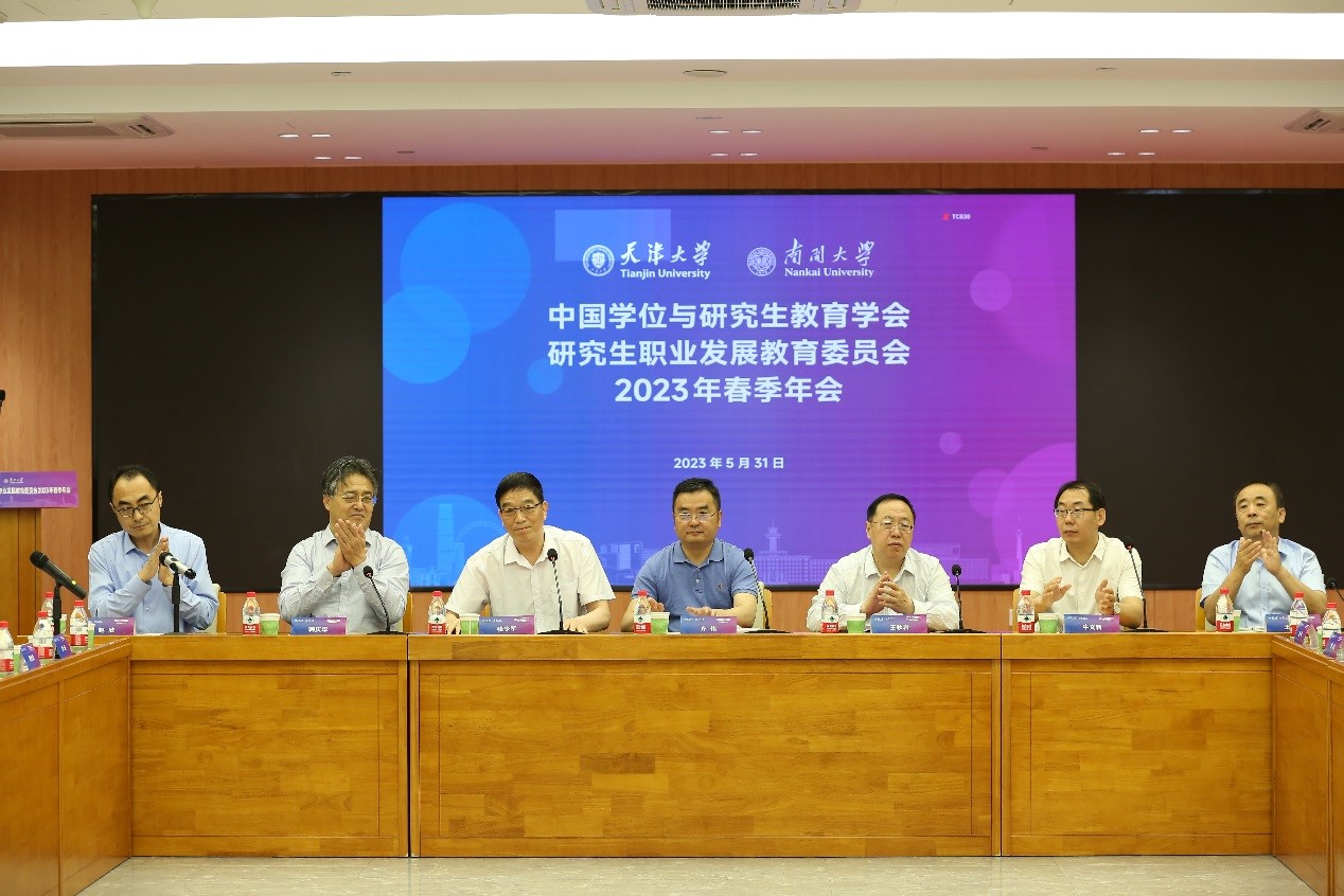 本站讯 5月31日,中国学位与研究生教育学会研究生职业发展教育委员会2023年春季年会在天津大学、南开大学举行。教育部学生服务与素质发展中心副主任方伟、天津市政府教育督导室总督学王秋岩、天津市人力资源和社会保障局二级巡视员张少军、南开大学党委副书记牛文利、天津大学党委副书记韩庆华以及中国学位与研究生教育学会研究生职业发展教育委员会委员单位有关同志参加了会议。会议由天津大学党委学生工作部部长、学生处处长赵欣主持。