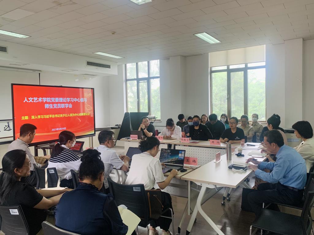 人文艺术研究所党支部教师孙列结合多年的创作经验和重彩壁画《世纪摇篮》的创作过程,分享了如何践行以人民为中心的创作导向,表示文艺创作最根本、最关键、最牢靠的办法是扎根人民、扎根生活。中文系教工党支部教师王祎结合习近平总书记重要论述中引用的诗文典故,分析了以人民为中心的发展思想的历史渊源和超越历史的时代价值。中文系教工党支部教师周游结合个人教学实践,畅谈了如何以学生为中心上好每一堂课,了解学生、吸引学生、引领学生和牢记学生的教学经验,提出要强化教师意识,将关爱学生、为了学生内化为教师本能。冯研院党支部教工党员冯翰宁讲述了冯骥才先生为非遗保护奔走的初心:非遗是人民创造的,要守住中华文化之根,还介绍了冯研院在丰富学生文化生活方面的经验和做法。