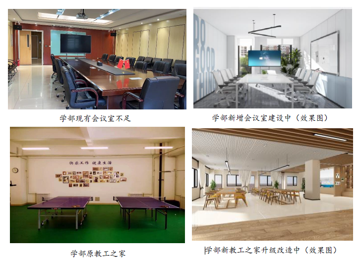 针对学部会议室数量不足的问题,学部扩建会议室面积200余平米,新规划会议室6间,对全部会议室进行会议系统智能化改造,以提高会议室使用效率。同时,学部对教工之家进行升级改造,增加更多实用功能,整体空间进行布局优化,规划设计讨论区,增加小规模报告厅、来访接待区等功能,极大提高空间利用率,为教工交流等提供更好的空间平台。