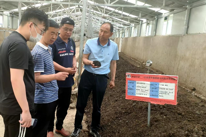 图片二:天津大学师生在有机肥厂指导发酵鸡粪与菌菇渣