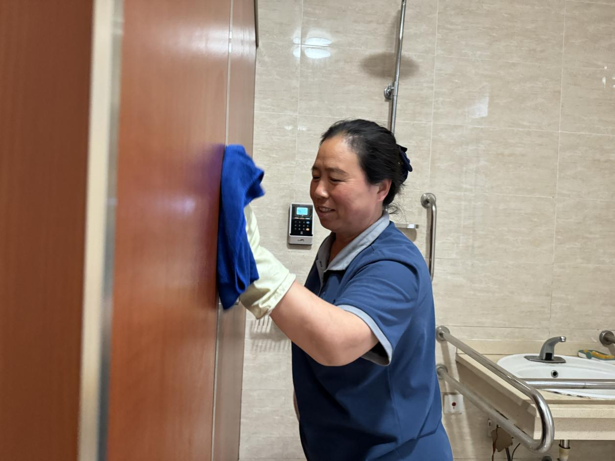 清晨五点,当24斋的同学们还沉浸在甜美的梦乡时,保洁员方侠早已开始了她的日常保洁工作。此刻,她正忙碌于淋浴间内,手中的抹布如同画笔般细腻,仔细描绘着每一个淋浴隔间的清洁画卷。她的眼神专注而执着,不放过任何一处细节。时而轻柔地擦拭,时而用力搓洗,将隔板上的灰尘和污渍一一清除。随着她熟练而有力的动作,隔板逐渐焕发出新的光彩,明亮而洁净。方侠的脸上洋溢着满意的笑容,她的辛勤付出,将为即将醒来的同学们带来一个清新、整洁的宿舍环境,为他们开启美好的一天注入活力与温馨。