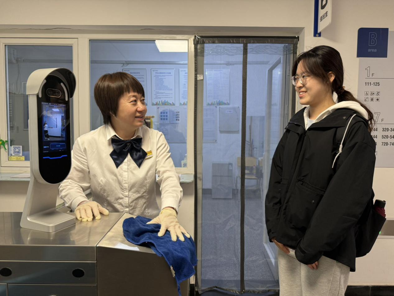 清晨,当第一缕柔和的阳光透过窗户,轻轻洒落在52斋时,宿管刘平已经开始了她日常的门前清洁工作。她手中的扫帚舞动得如此自如,宛如音乐家手中的指挥棒,引领着清洁的旋律。在她的细心清扫下,每一砖每一瓦都焕发出洁净而明亮的光彩。尽管春寒料峭,但刘平在忙碌的工作之余,仍不忘关心每一位来往的同学。她温柔地叮嘱道:“孩子们,今天降温了,记得多穿点衣服,别让自己受凉了。”她的每一个细微动作,每一句温暖的话语,都透露出对同学们的深深关爱。