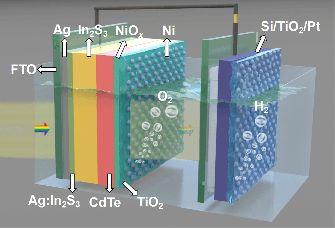 上图展示了一种创新的无偏压太阳能水分解系统。通过使用半透明硫化铟光电阳极与硅基光电阴极的串联结构,直接利用太阳能将水分子分解为氧气和氢气。