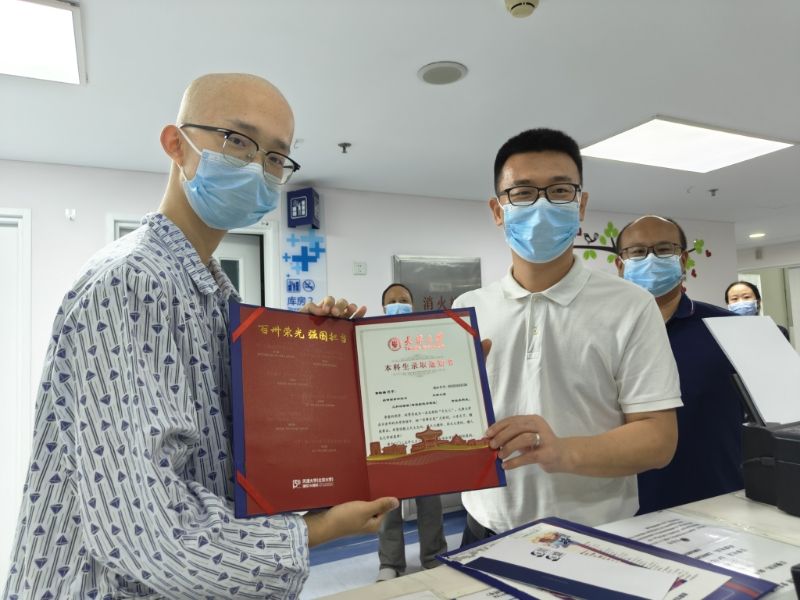 本站讯 “欢迎你加入天津大学这个大家庭,今后我们就都是‘天大人’了!”8月1日,北京清河医院血液科的病房中,今年以633分的成绩考入天津大学的贵阳一中学子黄裕腾,从专程赶来的天津大学本科生招生办公室主任刘坤手中接过录取通知书,亲自拆开了属于他的“天大的好消息”。