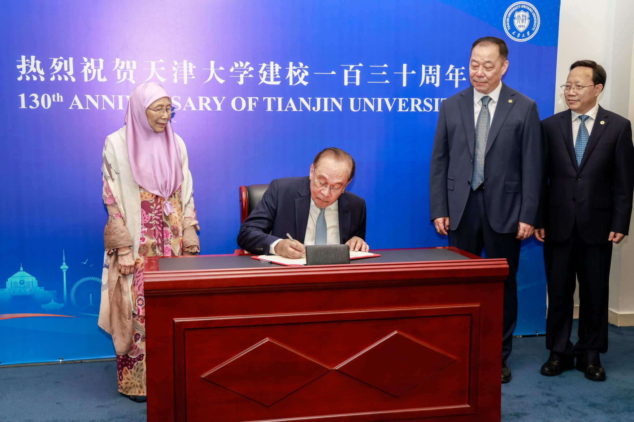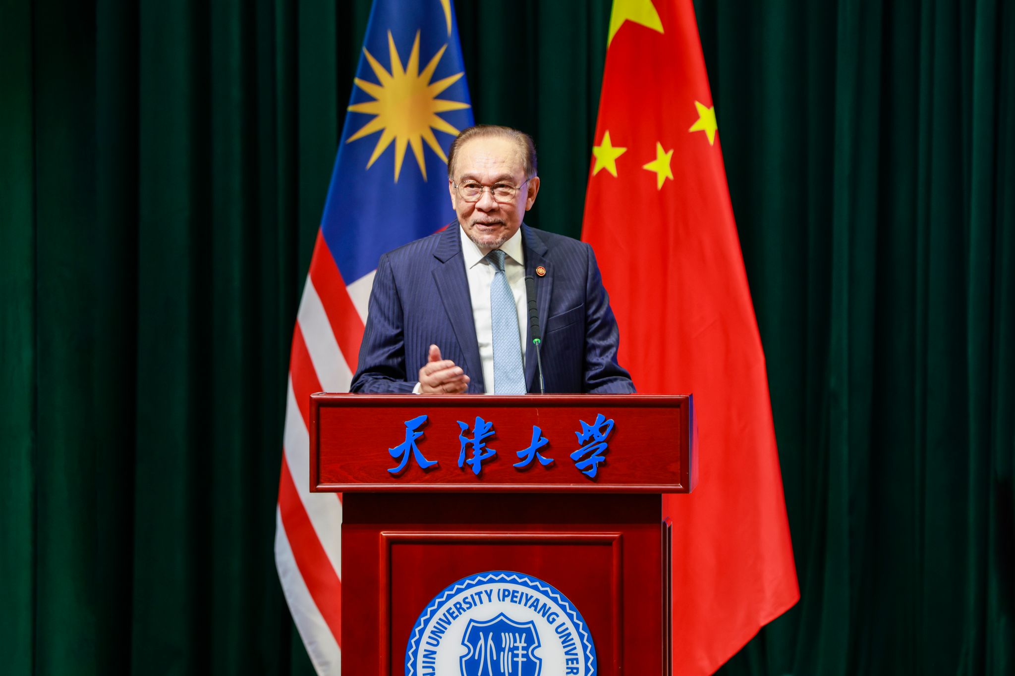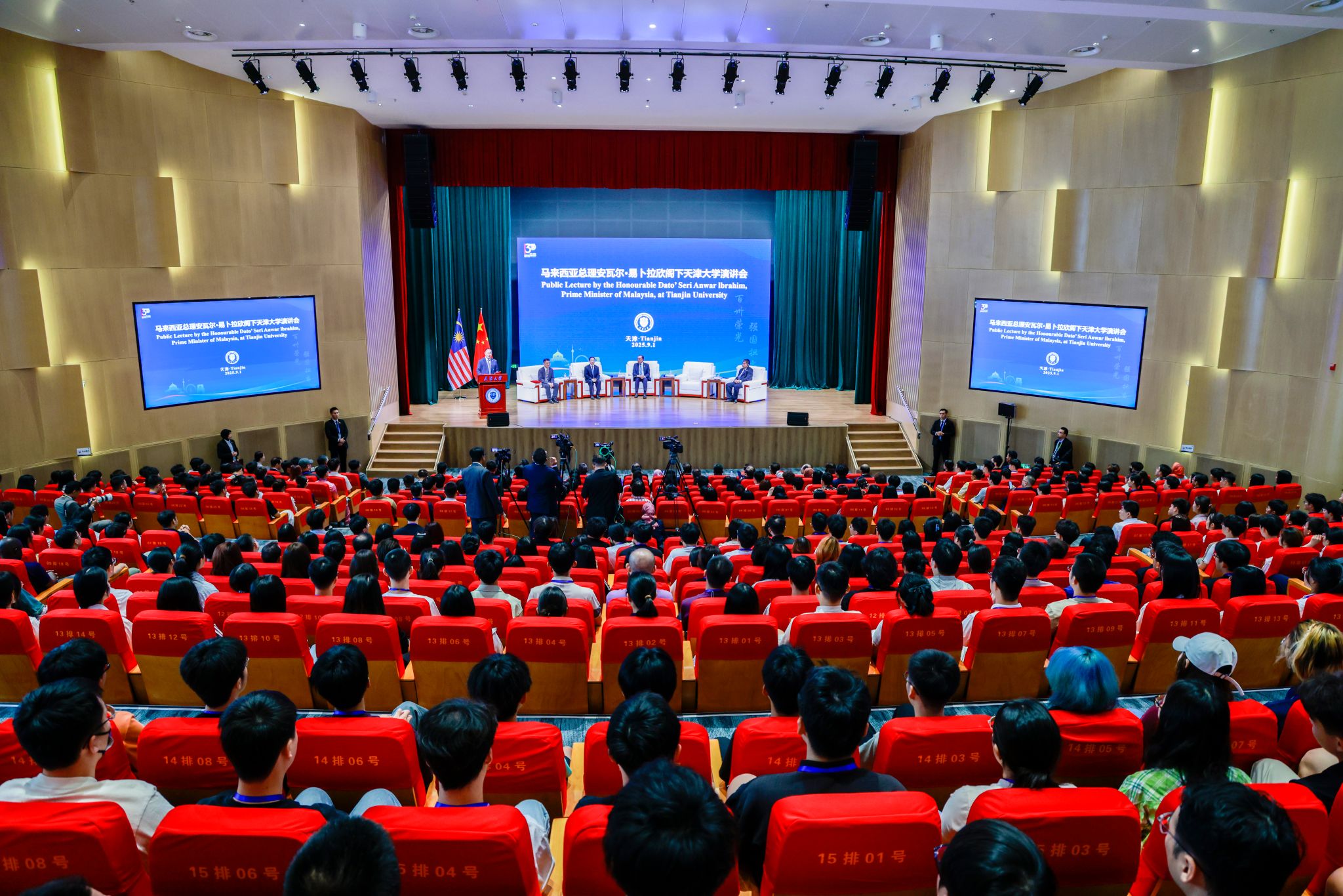 9月1日,马来西亚总理安瓦尔·易卜拉欣(The Honourable Dato’ Seri Anwar Ibrahim)阁下携夫人到访天津大学。安瓦尔总理以“主权互依:共建亚洲共享未来”为题发表演讲,阐述了当前全球经济格局中的挑战与亚洲的责任。他高度评价了天津大学的历史与贡献,指出:“天津大学从1895年的北洋大学堂起步,历经130年风雨,始终秉承‘实事求是’的校训,这不仅是学术的追求精神,也是治国理政的智慧。”