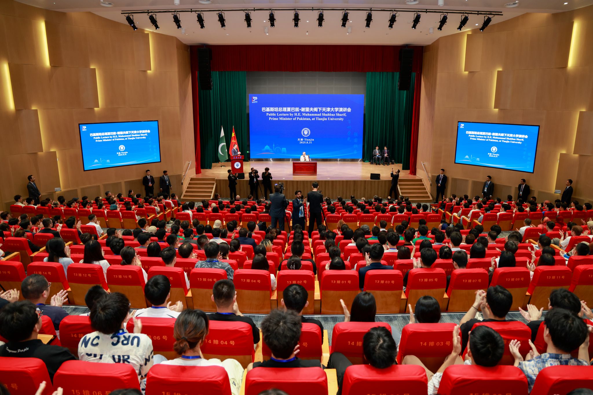 8月31日上午,巴基斯坦总理夏巴兹·谢里夫访问天津大学并发表演讲。巴基斯坦副总理兼外长穆罕默德·伊沙克·达尔、巴基斯坦规划、发展与特别项目部部长阿赫桑·伊克巴尔、巴基斯坦信息部部长阿塔乌拉·塔拉尔等陪同访问。