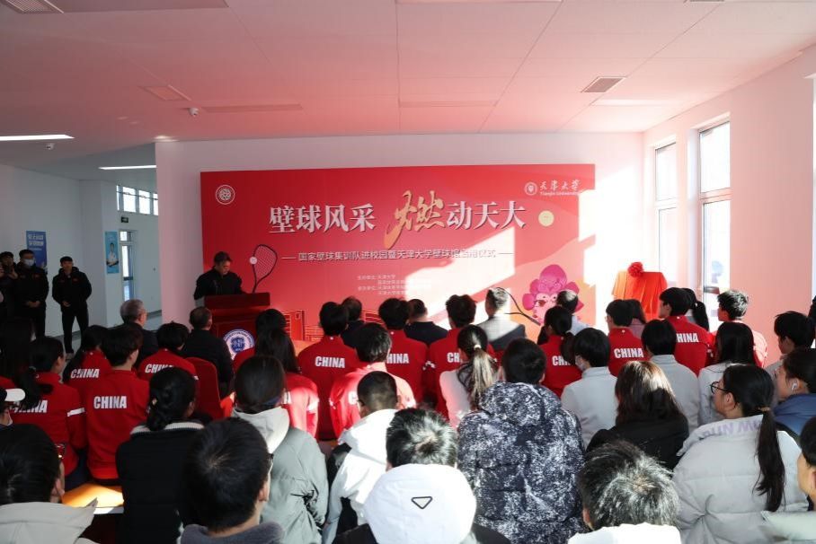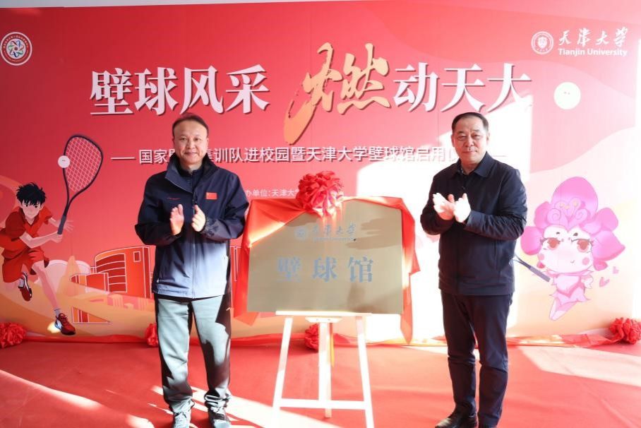 本站讯(通讯员 王晴)12月22日下午,“国家壁球队进校园”活动暨天津大学壁球馆启用仪式在北洋园校区举行。校党委书记杨贤金,国家体育总局小球运动管理中心副主任王赟出席活动并为壁球馆揭牌。天津体育学院副院长杨智、国家体育总局小球运动管理中心壁球部部长王鼎、天津体育学院竞技运动学院院长刘世军,学校后勤基建部、校友与基金事务处、体育部、场馆中心相关负责人及师生代表近200人参与活动。校党委副书记韩庆华主持仪式。