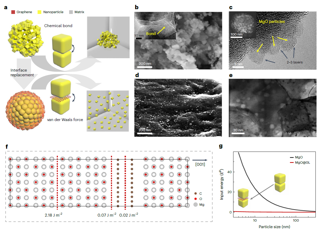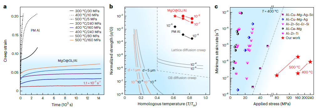 为此,天津大学材料学院何春年教授团队提出并通过“界面置换”分散策略制备了5纳米级氧化物弥散强化铝合金,即首先利用金属盐前驱体分解过程中的自组装效应制得了少层石墨包覆的超细氧化物颗粒,将纳米颗粒之间较强结合的化学键替换为石墨包覆层之间较弱的范德华力结合,从而使纳米颗粒之间的粘附力降低了2~3个数量级;在此基础上,通过简单的机械球磨-粉末冶金工艺实现了高体积分数(体积分数为8%)的单粒子级超细氧化物颗粒在铝基体内的均匀分散,并使铝合金展示出极其突出的高温力学性能与抗高温蠕变性能,其在300℃和500℃下的抗拉强度分别为420兆帕和200兆帕;在500℃和80兆帕的蠕变条件下,稳态蠕变速率为10的负7次方每秒,大幅超越了国际上已报道的铝基材料的最好水平。
