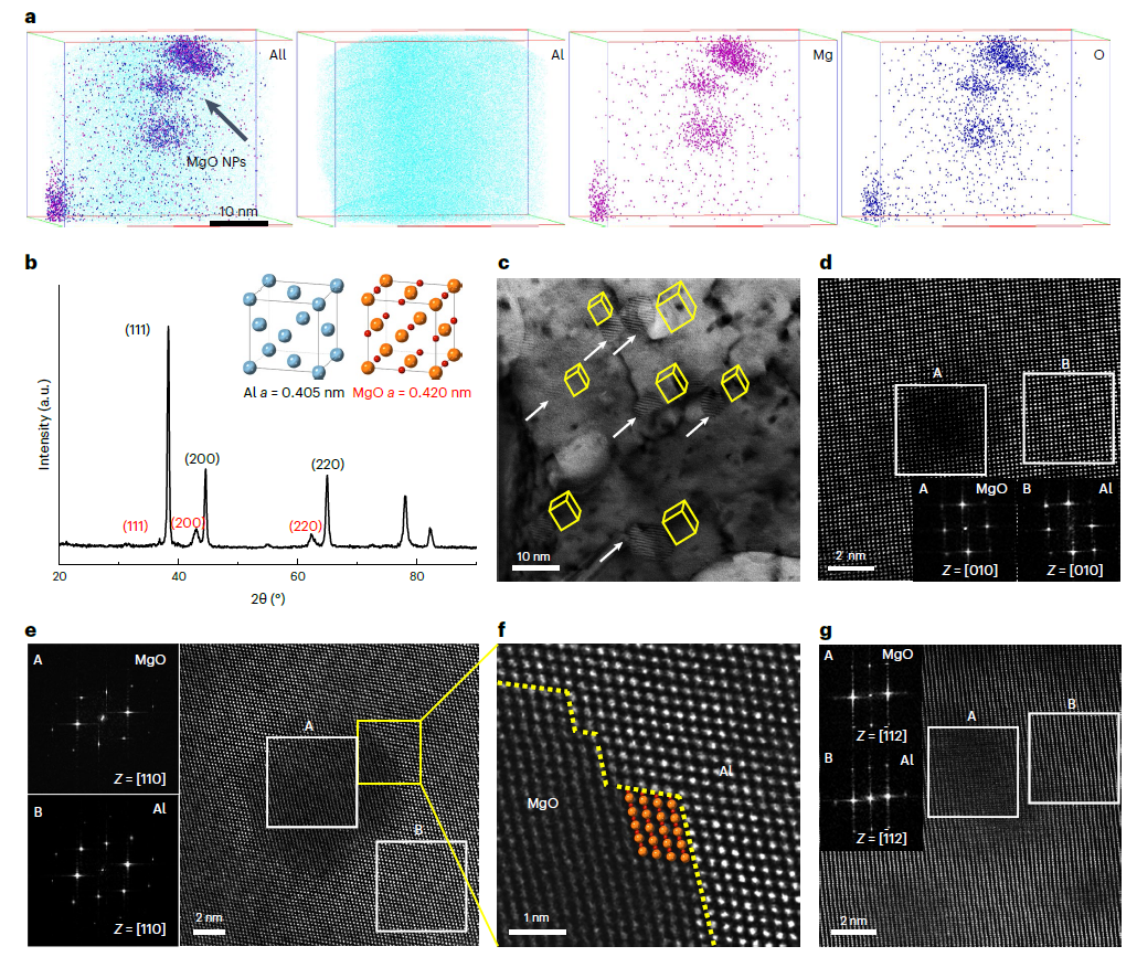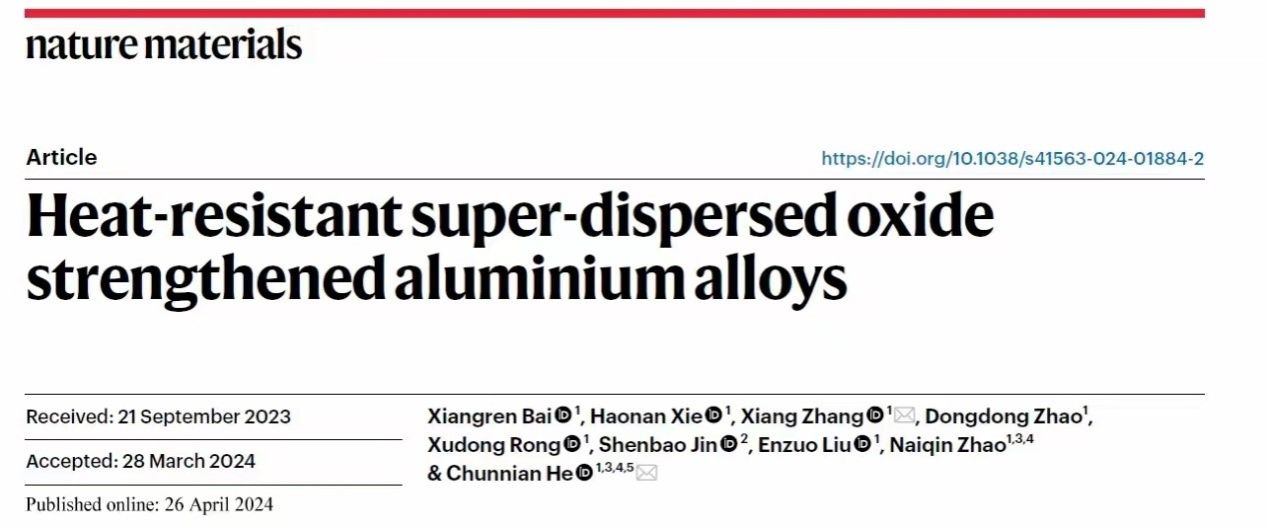 相关研究成果以“超分散氧化物强化的耐热铝合金”为题发表于《自然材料》(Nature Materials)期刊上。论文第一作者为博士生白翔仁,通讯作者为何春年教授与张翔副研究员,合作作者有天津大学赵乃勤教授、赵冬冬副教授、刘恩佐副教授、戎旭东副研究员、博士生谢昊男、河北工业大学靳慎豹教授。该工作得到了国家杰出青年基金、国家自然科学基金重点项目等项目的资助。