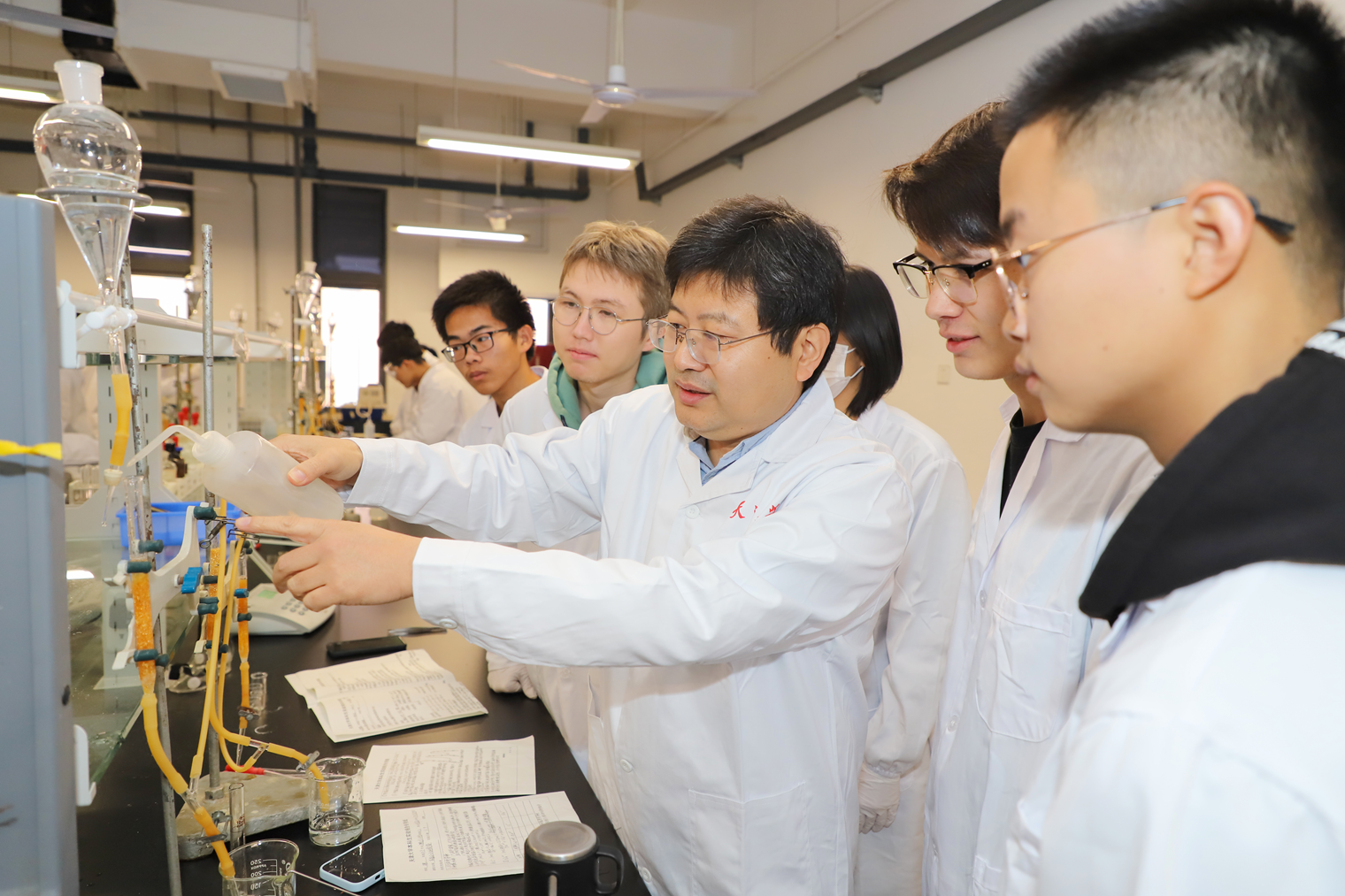 马骁飞(右3)指导学生做实验