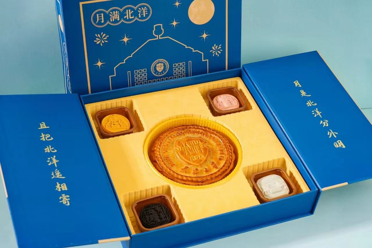 今年天津大学后勤基建部推出了六款风格各异的月饼礼盒,包括两款团圆版月饼礼盒及桃山版、校徽版、纪念版、糖醇版等多种样式,让师生有了更多选择:月饼礼盒设计精巧,多以天大人引以为傲的“北洋蓝”为底色,纹样独具匠心,用简约的线条刻画出学校地标景观,校徽、繁星与烟花璀璨辉映;多种月饼饼皮采用了双拼撞色工艺,馅芯采用南洋椰香、土凤梨等口味,温馨推出的糖醇版更是减少负担而美味不减。