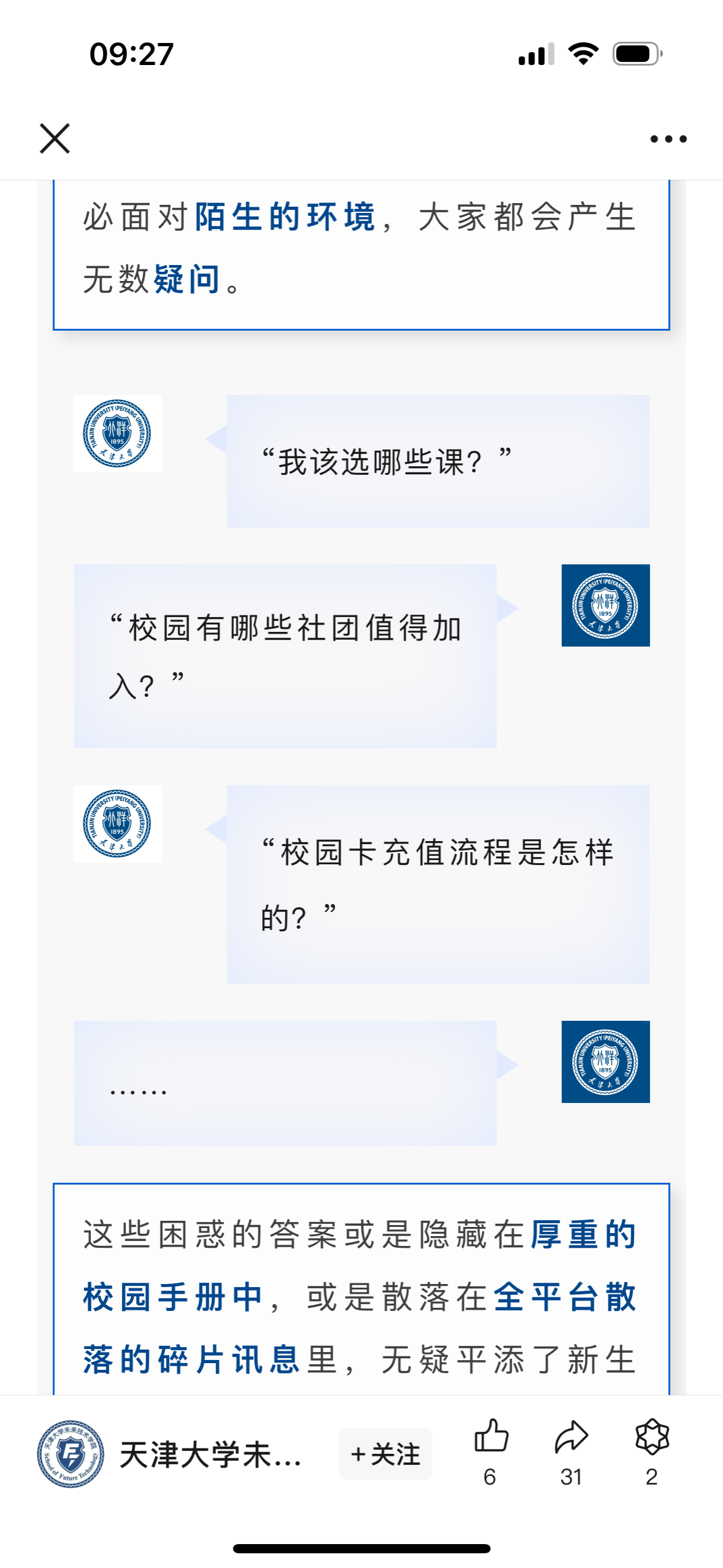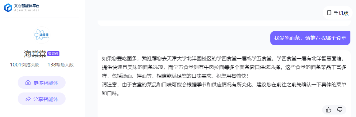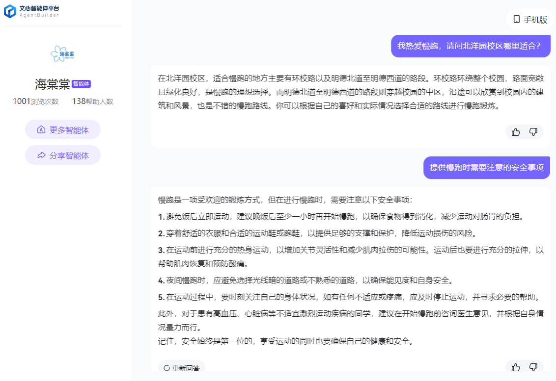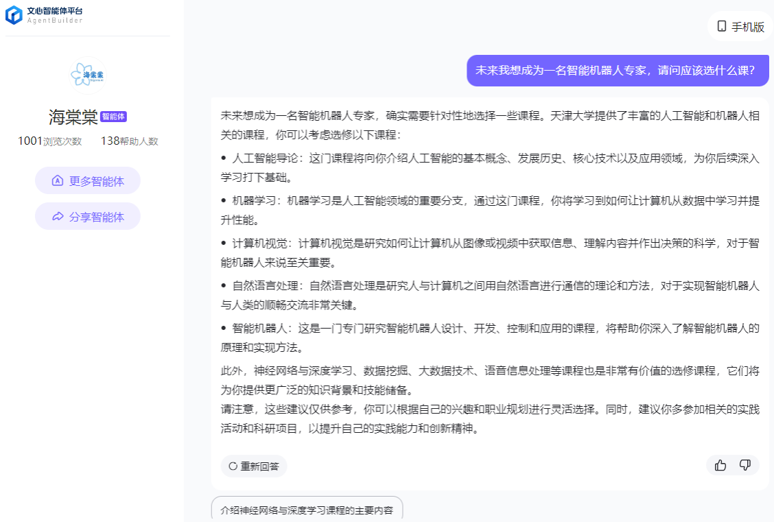 本站讯(记者赵晖) “我该选哪些课?”“想保研怎样攒绩点?” “校园有哪些社团值得加入?” “校园卡充值流程是怎样的?”……为及时解答新生入学的各种疑问,天津大学推出了一个实时在线的“热心学长”,24小时解答新生在学术科研、校园生活、个人发展等方面的各类常见问题。这就是“AI学长”——新生智能体“海棠棠”。