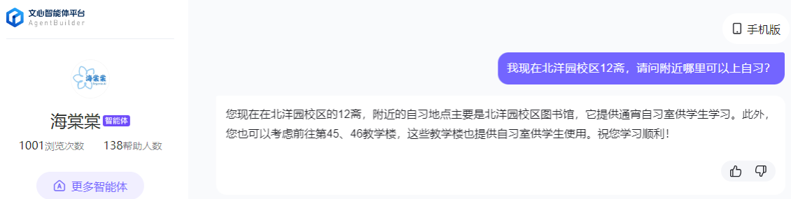 海棠棠是“天大百事通”,以文心大模型为基座模型,汇集百余个官方媒体平台的海量信息,化身为贴心的“学长”,为大家“秒抓取”全网信息,解决学习、生活各方面的问题,帮助大家更加了解天大,适应大学生活。手机端和电脑端都能访问海棠棠,在线等的各种问题,随时都能得到答案。