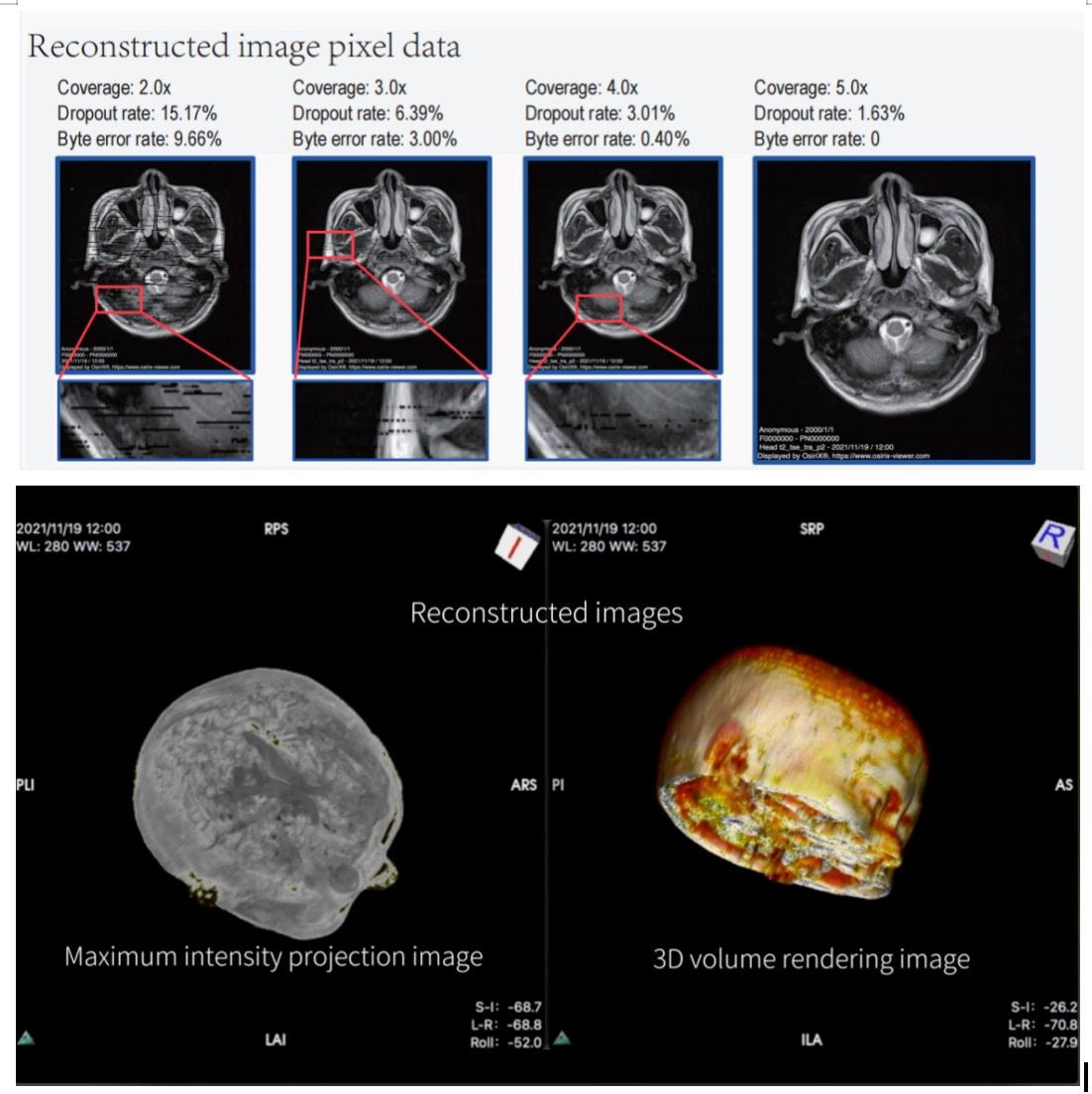 “DNA Palette”是针对脑部核磁共振数据特征而设计的创新编解码方案,展现出极高的适配性和实用性。该研究团队将11.28 兆字节的临床脑部核磁共振影像数据编码为约25万条DNA序列,净信息密度达到2.39 比特每碱基。在具有压缩效果的同时,避免了数据压缩算法的错误敏感问题,在测序覆盖度为2x和3x时也能够恢复出尽可能多的信息,并在低于大多数现有研究的平均测序覆盖度(4.4x)下,实现了原始数据的无损恢复。这些DNA以干粉形式稳定存储,质量仅为3微克,可支撑超过300次依据当前技术标准的读取操作。