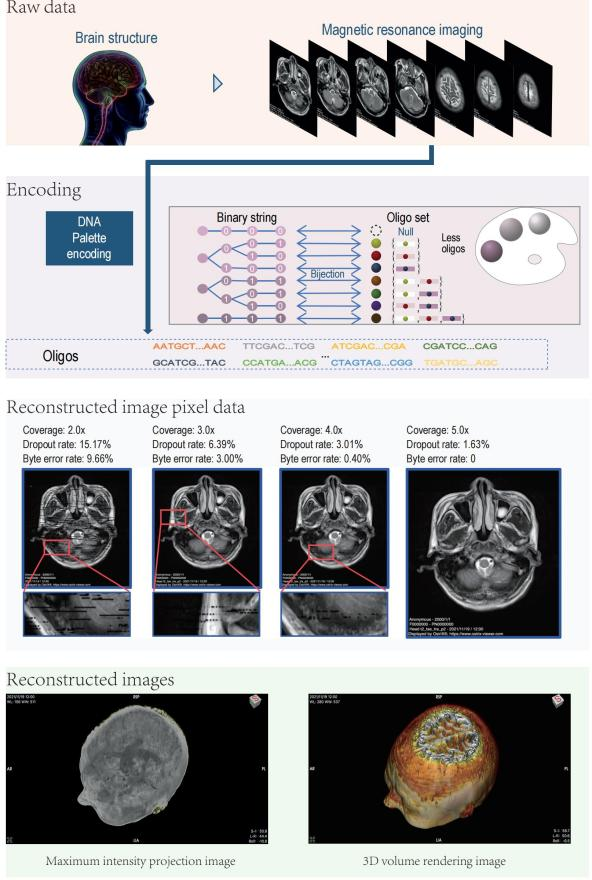 本站讯(记者 赵晖)近日,天津大学合成生物学研究团队与天津市环湖医院合作提出了一种创新的DNA信息存储编解码方案——“DNA Palette”。通过体外存储实验,该方案成功将患者疾病全周期的脑部核磁共振影像数据编码至DNA,并无损解码,实现影像数据的三维重建和病理诊断,为医疗数据存储技术提供了新解决方案。该成果发表在《国家科学评论》上。
