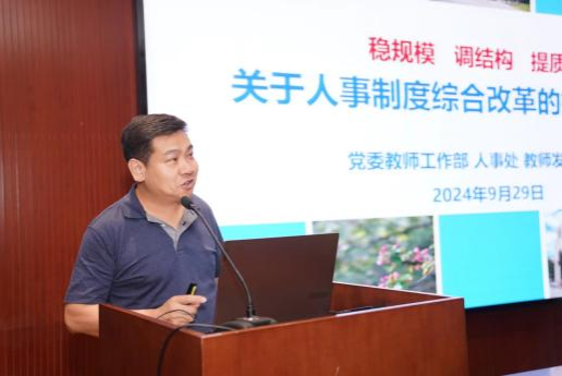 党委教师工作部部长、人事处处长栗大超对近期人事人才工作政策进行详细解读,为各学院提供政策层面的指导和支持。栗大超表示,学校始终高度重视师资队伍建设工作,以习近平总书记重要讲话和全国教育大会精神为引领,深入开展人事制度综合改革的探索与实践,通过做“精”教学科研系列队伍、做“强”服务支撑系列队伍、做“实”职业发展服务体系等三大类工作,助力师资队伍高水平发展。