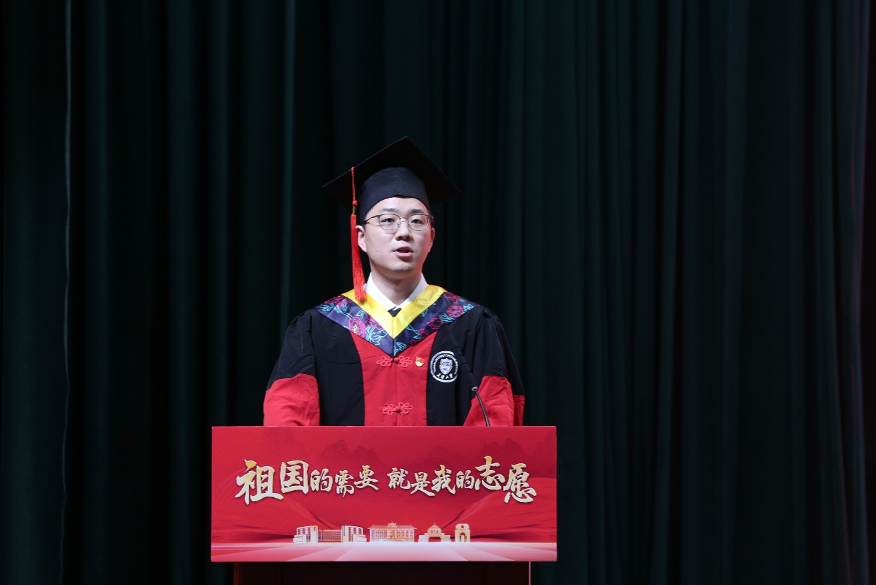毕业生党员代表、材料学院2024届博士生巴凌志讲述了自己求学时被学校氛围熏陶、导师言传身教的故事,立志将七年间在天大习得的知识和本领融入到“两弹一星”精神中去,做民族脊梁,为国之重器的研制生产贡献属于自己的一份“天大”力量。